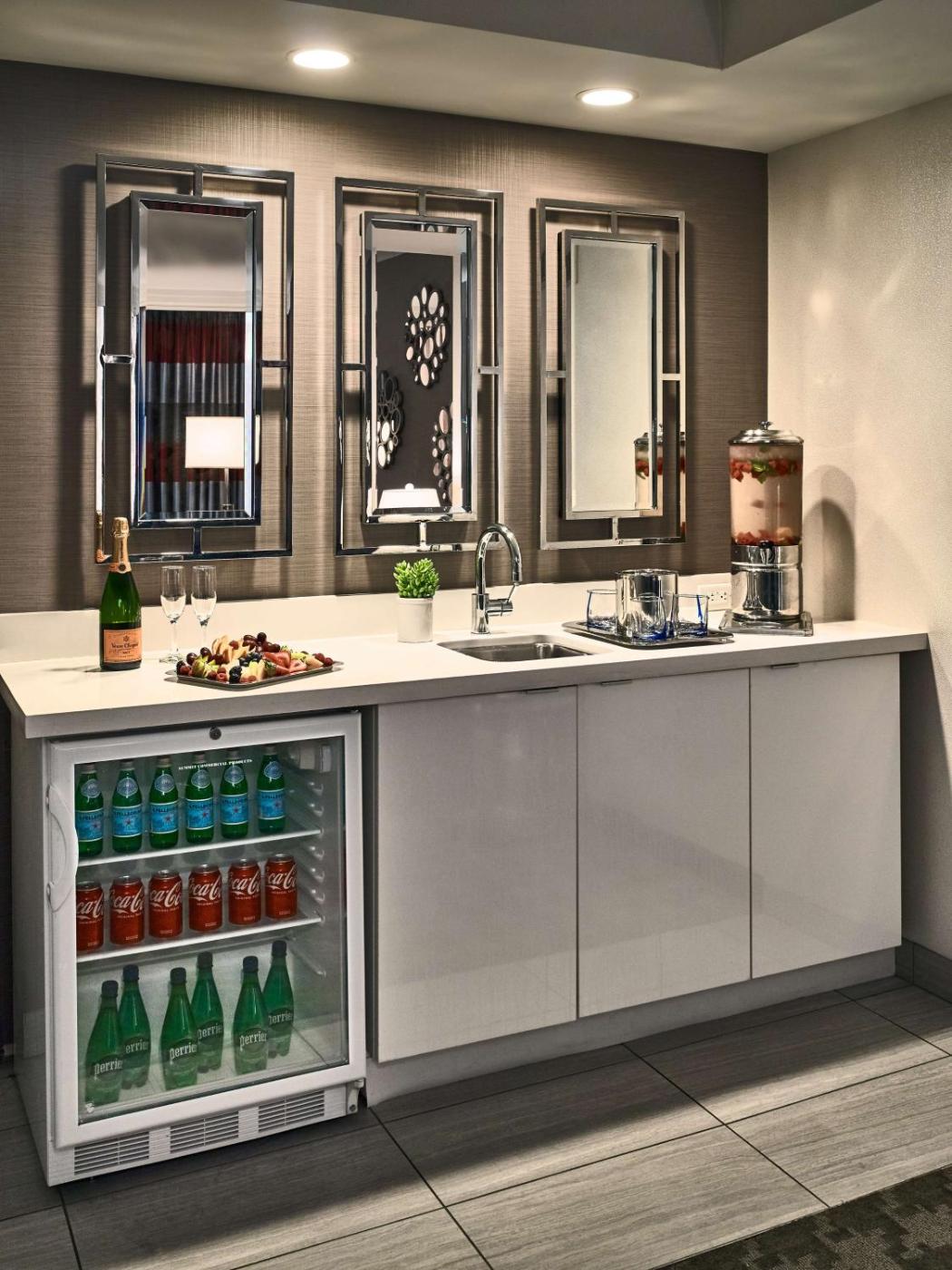 Corner Suite - King Bed - Sofa Bed. The suites offer a view of the City Hall and features a tiled entryway and a living room. The living room has a queen size sleeper sofa and a refrigerator with a wet bar. The bedroom includes an en-suite bathroom with a dressing area, a settee and a work station. Flat-screen TV, bathrobes, complimentary WiFi, in-room safe, iHome docking station for iPhone 4, Kuerig coffee machine and complimentary bottled water are also included. ;